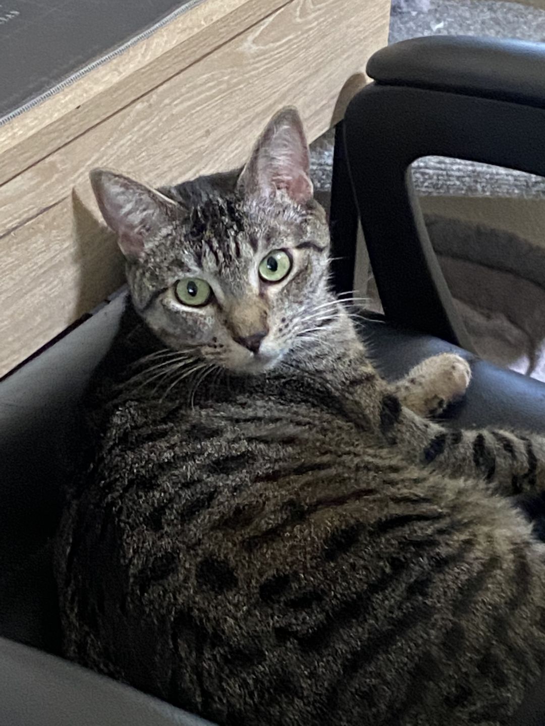 Indira is a stealth sweet girl. Her shiny and sleek coat is naturally camouflaged, so it’s easy for her to sneak up on her toys. She is nicknamed “The Hunter” because she is always the first kitty to go after the toy. She is silent when she walks or runs. She will catch a toy with claws but immediately change to play with soft paws and light teeth. She likes high places to nap and watch what’s going on. She likes being the supervisor of all happenings and doesn’t necessarily want to participate in everything. She will watch you eat but won’t beg. She has a very quiet meow and doesn’t use it often. She isn’t super food motivated so leaving dry food out for her will be easy. Her favorite toy is anything on a string!