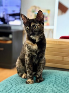 Dove is the reflection of her name. She is a very sweet, cuddly, and playful kitten. She loves to greet you with a nose smooch and snuggle right next to you at night when you sleep. She loves to play with toy mice and fuzzy toy balls and absolutely loves her food! She has the brightest little eyes and meow and is sure to melt your heart. She gets along well with other kitties, old and young and loves children. Will you be her furever?