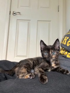 Although she’s tiny, she sure is spunky! She loves to play and wrestle with her brother, Lolo. When she isn’t running around, causing adorable chaos, she loves to sleep curled in a ball either next to you or in a random little corner or under a shelf. She does love cuddles but most of the time, it needs to be on her terms and once she starts purring, she’s like butter in your hands!